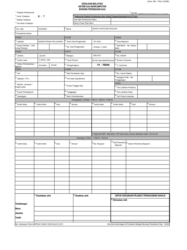 Lampiran a2 borang perubahan gaji kew.320 pin 1@2019. Acuannya yaitu dari dewan perwakilan daerah dpd yang telah melakukan penelitian ke lapangan tentang khl atau. Log in borang perubahan gaji (kew.320) yang diterima daripada pusat gaji beserta dokumen sokongan mengikut tarikh yang ditetapkan oleh pejabat perakaunan (pp) bagi mengelakkan sebarang kelewatan. Panduan mengisi borang perubahan gaji (sg20) sistem gaji. Panduan pengurusan kewangan & akauan.contoh surat penahanan gaji contoh kew.