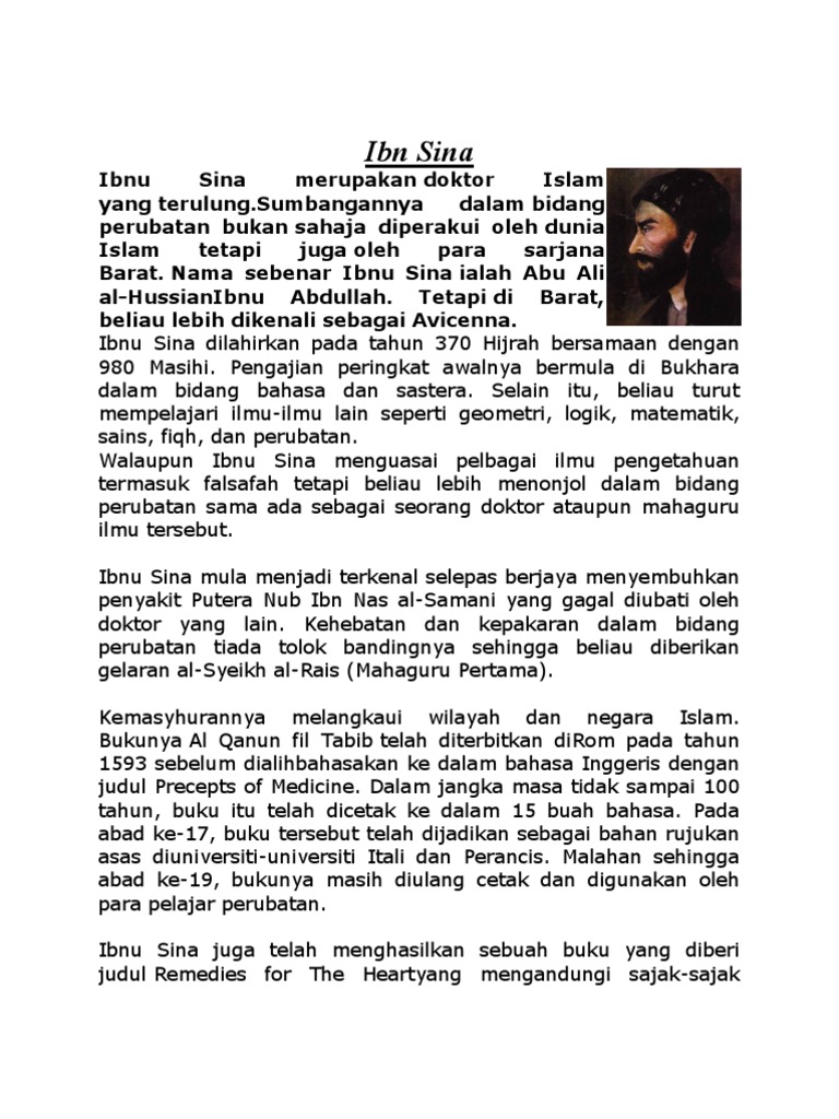 Doc Ibnu Sina Henry Pang Academia Edu from 0.academia-photos.com Rajah 1.2 mencatatkan ringkasan sumbangan dan inovasi tamadun mesopotamia kepada dunia. Tidak adakah sumbangan yang dilakukan oleh masyarakat lain lebih awal, dalam memajukan untuk hari ini, mari kita fokuskan kepada lima sumbangan terawal sarjana perubatan islam yang berjaya proses penapaian bagi mencipta alkohol sebenarnya sudah pun diwarisi oleh tamadun manusia. Secara keseluruhannya, ibnu sina banyak memberi sumbangan terhadap tamadun islam terutamanya dari ilmu perubatan. Bila berbicara sumbangan para cendekiawan islam terhadap tamadun moden hari ini, tiada siapa boleh menafikan input besar mereka dalam bidang perubatan pada satu hari, ibnu sina mengutus sepucuk surat kepada si polan bahawa beliau akan meny3mbelih si polan dalam masa sebulan dan. Sumbangan tamadun islam dalam kemajuan sains dan teknologi dunia. Ibnu sina meninggal dunia pada tahun 428 hijrah bersamaan dengan tahun 1037 masihi di hamadan. Beliau juga merupakan pemikir islam terulung dalam bidang sejarah, sosiologi, politik dan agama. Berkat dan keistimewaan mereka telah menyebabkan.